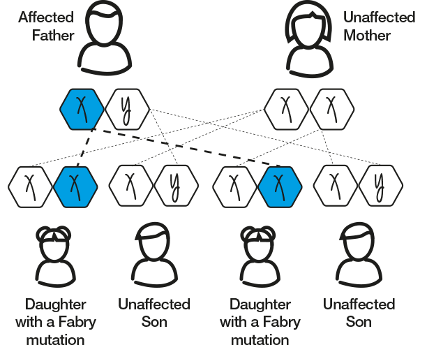 Men and women can both be affected by Fabry but the likelihood of a father or a mother passing down the Fabry mutation is not the same.1,2 It depends on the chromosomes they pass onto their children.1