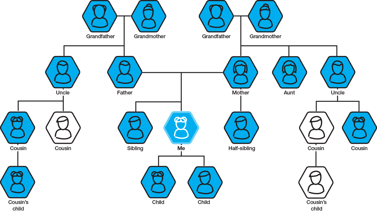 The people highlighted in blue could have the Fabry mutation, but in reality, it is unlikely that they all will. As Fabry is rare and you only need one Fabry mutation to experience the disease, it is likely that only one side of your family will be affected, for example.